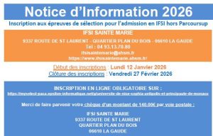 Cette notice n’a de valeur que pour l’IFSI SAINTE MARIE . Si vous envisagez de vous inscrire dans un autre IFSI, vous devrez vous procurer sa notice